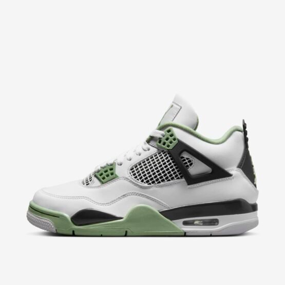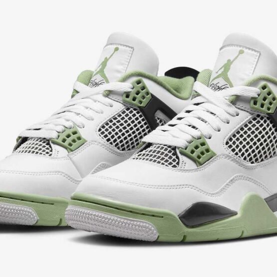 Τα γυναικεία παπούτσια Air Jordan 4 Retro Seafoam, συνδυάζουν τον χρωματικό διαχωρισμό εμπνευσμένο από τα OG, που θυμίζει την αρχική κυκλοφορία FIRE RED του 1989, με κλασικά υλικά και παστέλ χρώματα. Το επάνω μέρος είναι κατασκευασμένο από απαλό λευκό δέρμα με πράσινες αντιθέσεις στα κορδόνια, την εσωτερική επένδυση και το λογότυπο Jumpman που βρίσκεται στην ετικέτα της γλώσσας Flight. Η φτέρνα διαθέτει μονάδα Air Sole και το επάνω μέρος αποτελείται από μία πινελιά πράσινου χρώματος.