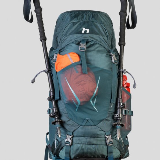Σακίδιο πλάτης διπλού θαλάμου, ρυθμιζόμενο σύστημα πλάτης – Σύστημα Vario, ενισχυμένο τμήμα πλάτης, επενδυμένοι ιμάντες ώμου, διαμορφωμένη ζώνη μέσης με δύο τσέπες, ζώνη στο στήθος με σφυρίχτρα, καπάκι με εσωτερική και εξωτερική τσέπη, πλευρικούς ιμάντες συμπίεσης, τσέπη και έξοδος για νερό, δύο θήκες για τσεκούρι πάγου ή στύλους πεζοπορίας, θήκη για φως που αναβοσβήνει, βάση από άλλο υλικό, δύο ευρύχωρες πλαϊνές τσέπες, μπροστινή δικτυωτή τσέπη, ενσωματωμένο κάλυμμα βροχής με ανακλαστικά στοιχεία.